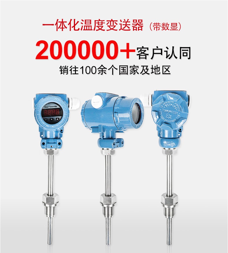 一体化温度变送器是温度传感器与变送器的结合,以十分简捷的方式把 -200~+1600 ℃ 范围内的温度信号转换为二线制 4~20mA DC 的电信号传输给显示仪、调节器、记录仪、 DCS 等,实现对温度的测量和控制。一体化温度变送器是现代工业现场、科研院所温度测控的更新换代产品,是集散系统、数字总线系统的产品。